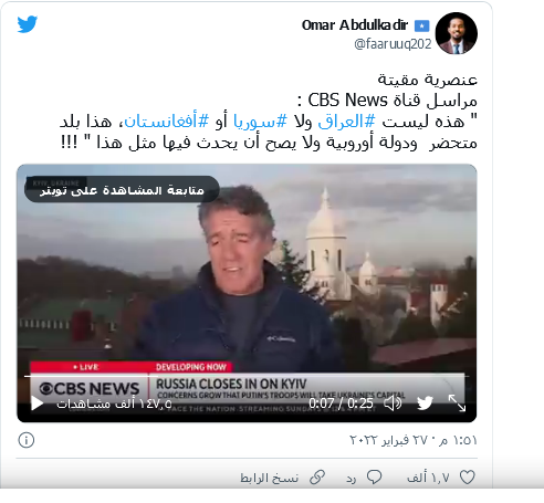 وعلى سبيل المثال قال مراسل “سي بي إس نيوز”، خلال بث مباشر: “هذا ليس مكانا، مع الاحترام، مثل العراق أو أفغانستان أو سوريا، حيث نشهد نزاعات منذ عقود، هذا مكان حضاري نسبيا وأوروبا إلى حد ما”.