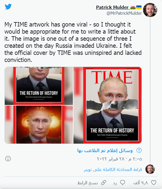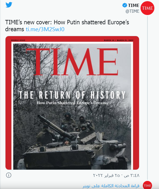 أمّا أحدث إصدار لشهر آذار/ مارس 2022 والمنشور على موقع “تايم” وفي حساباتها على مواقع التواصل، فلم تستخدم فيه أي صورة لبوتين، بل صورة لدبابة.