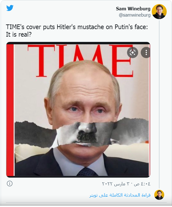 وعرضت المنشورات صورة للرئيس الروسي فلاديمير بوتين ممزقة على مستوى الوجه بين الفم والأنف لتكشف عن شارب أدولف هتلر، وزعم ناشروها أنها غلاف لمجلة “تايم” الأمريكية.