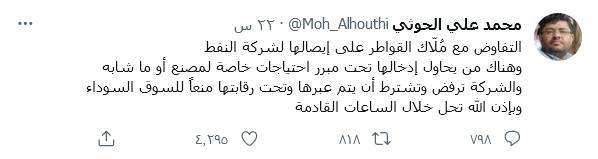 وقال الحوثي في تغريدة على حسابه في “تويتر”، :” التفاوض مع مُلّاك القواطر على إيصالها لشركة النفط، مشيراً إلى ان هناك من يحاول إدخالها تحت مبرر احتياجات خاصة لمصنع أو ما شابه.