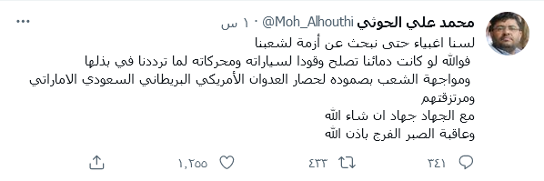 وقال محمد علي الحوثي في تغريدة له على موقع التواصل الاجتماعي “تويتر” لسنا اغبياء حتى نبحث عن أزمة لشعبنا فوالله لو كانت دمائنا تصلح وقودا لسياراته ومحركاته لما ترددنا في بذلها “.