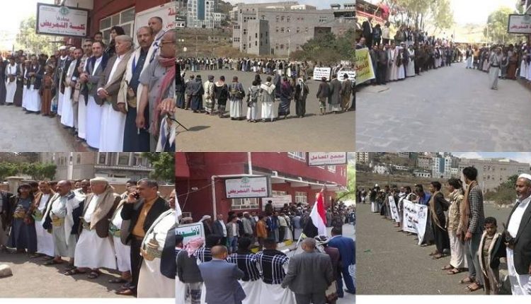 نظم أبناء مديريتي ريف إب وجبلة بمحافظة إب اليوم الخميس، وقفة احتجاجية للتنديد بجرائم العدوان والحصار واحتجاز سفن المشتقات النفطية ودعم حملة إعصار اليمن.