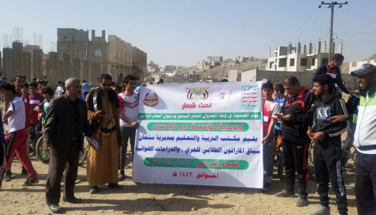 تحت شعار (يوم الصمود في وجه العدوان للعام السابع ودخول العام الثامن) وبرعاية مؤسسة درب الإحسان، نظم مكتب التربية والتعليم بمديرية سنحان في محافظة صنعاء صباح اليوم سباق ماراثون طلابي للجري والدراجات الهوائية وبمشاركة عدد من مدارس المديرية.