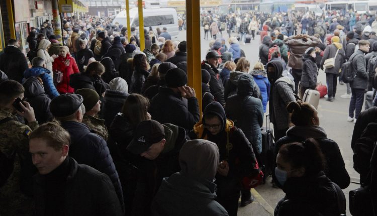 إلى جانب مبنى سكني دمر نصفه، وحطام مركز للتسوق، كان حشد من الناس يقفون وسط الثلوج الذائبة في انتظار حافلة تخرج بهم من المدينة. لم يكن هناك جدول للمواعيد، فقط شائعة عن قرب وصول حافلات.