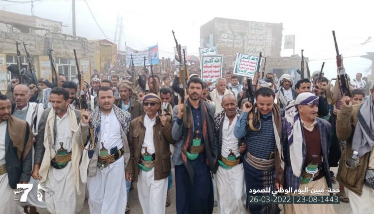 وأكد المشاركون في المسيرات التي أقيمت بمديريات عبس وأسلم وكعيدنة وقفل شمر ووضرة استمرار النفير العام في مواجهة العدوان وإفشال مخططاته والتحشيد للجبهات ومساندة الجيش واللجان الشعبية في ميادين الصمود حتى تحقيق النصر.