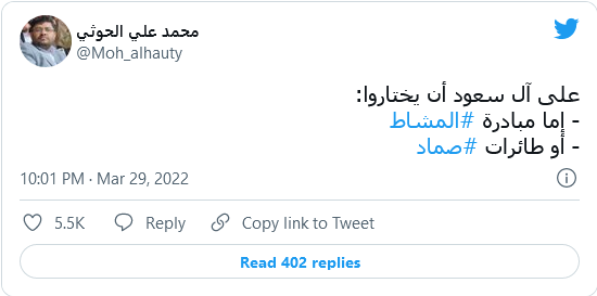 وقال الحوثي في تغريدة مقتضبة نشرها على حسابه في تويتر: “على آل سعود أن يختاروا: مبادرة المشاط ،أو طائرات صماد ، في اشارة منه الى تأكيد استهداف السعودية في حال رفضها للمبادرة وعدم التجاوب معها, او محاولة الالتفاف عليها بمبادرات منقوصة.