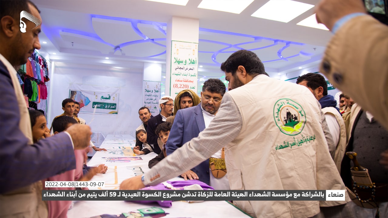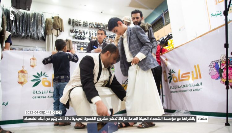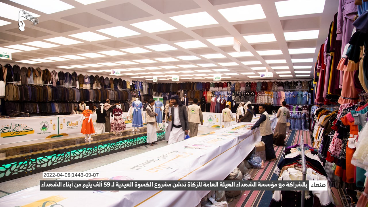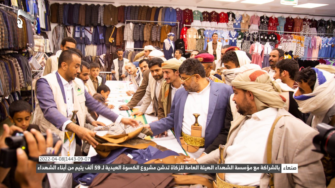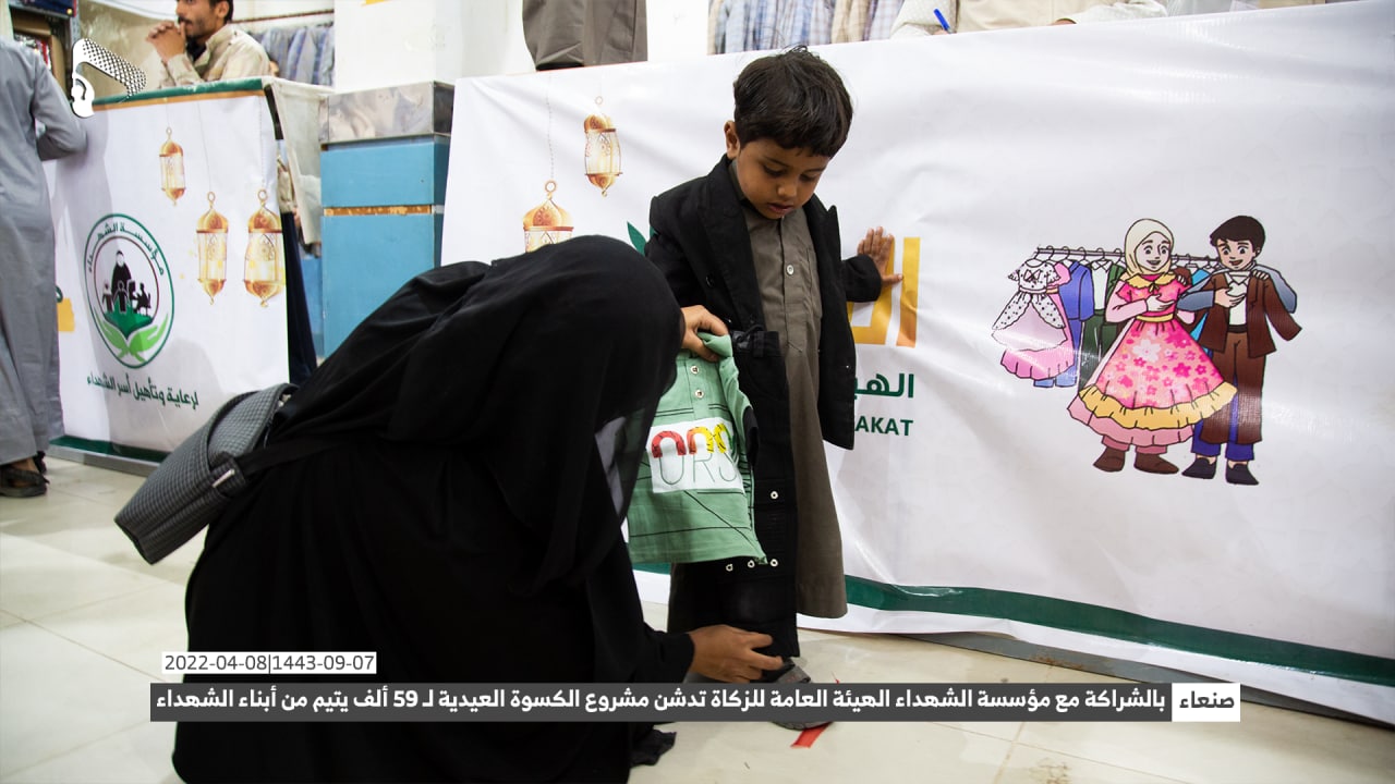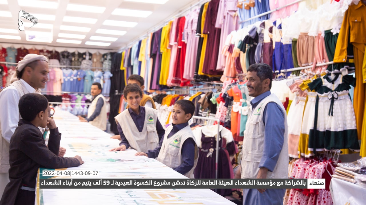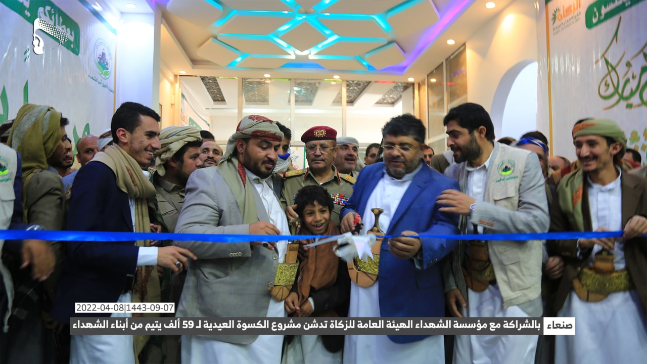 دشنت مؤسسة الشهداء بالشراكة مع الهيئة العامة للزكاة اليوم، مشروع الكسوة العيدية لعدد 59 ألف يتيم من أبناء الشهداء في عموم محافظات الجمهورية.