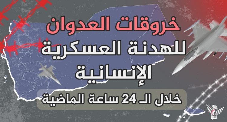 وشملت خروقات قوى العدوان عمليات هجومية وغارات جوية وعمليات تحليق بطيران العدوان الحربي والأباتشي والتجسسي واستهدافات صاروخية ومدفعية وتمشيط مكثف بالأعيرة النارية المختلفة.