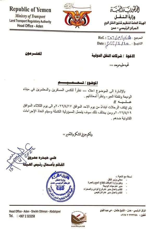ووفق وثيقة صادرة عن هيئة النقل البري في عدن، فقد تقرر إيقاف الرحلات إبتداءً من يوم الأحد 17 أبريل، وحتى يوم الثلاثاء، وحملت الهيئة شركات النقل الدولية مسؤولية مخالفة ذلك التعميم ووعدت باتخاذ إجراءات قانونية بحقها.