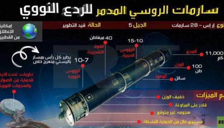 وتابع: “بإمكان الصاروخ الجديد ضرب أهداف على مسافات بعيدة باستخدام مختلف مسارات التحليق، ويتمتع صاروخ “سارمات” بمواصفات فريدة تتيح لها بشكل واثق اختراق كل وسائل الدفاع الصاروخي الموجودة والمستقبلية”.