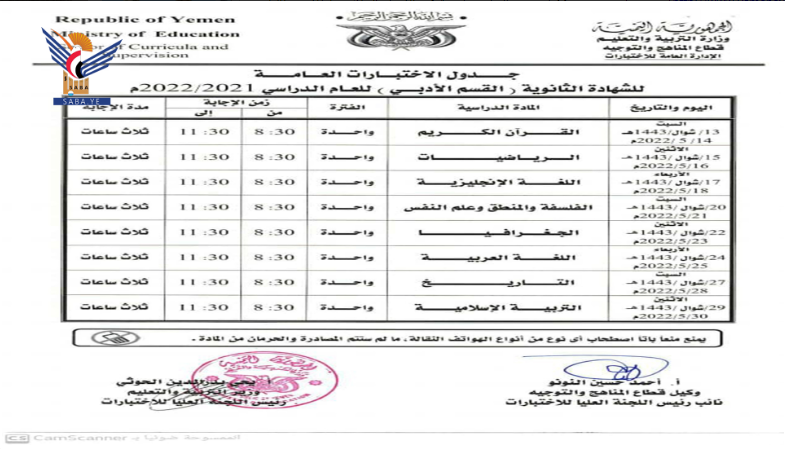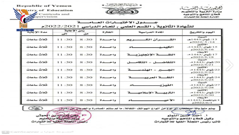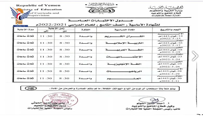 أعلنت وزارة التربية والتعليم جداول سير الاختبارات النهائية للشهادة العامة الأساسية والثانوية بقسميها العلمي والأدبي للعام الدراسي 1443 هجرية.