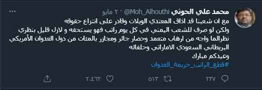 واختتم عضو السياسي الأعلى تغريدته مستدركا بقوله : “ولكن لو صرف للشعب اليمني في كل يوم راتب فهو يستحقه ولازال قليل بنظره ، نظرا لما واجه من إرهاب متعمد وحصار جائر ومجازر بالمئات من دول العدوان الأمريكي البريطاني السعودي الإماراتي وحلفائه”.