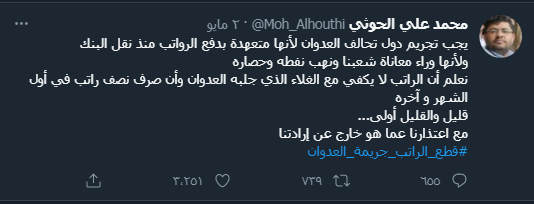 وأشار الحوثي في تغريدات له على ” تويتر ” تحت هشتاق #قطع_الراتب_جريمة_العدوان، إلى أن دول تحالف العدوان وراء معاناة شعبنا ونهب نفطه وحصاره.