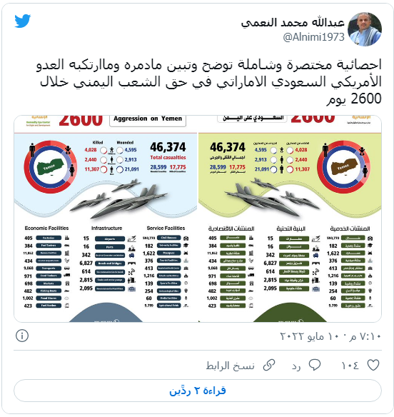 أصدر مركز عين الإنسانية للحقوق والتنمية إحصائية عن جرائم العدوان الأمريكي السعودي خلال2600 يوم
