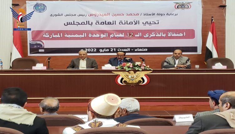 نظّمت الأمانة العامة لمجلس الشورى، اليوم، فعالية احتفالية بمناسبة العيد الوطني الـ32 للجمهورية اليمنية 22 مايو، بحضور رئيس المجلس محمد حسين العيدروس.