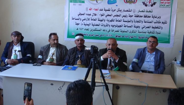 نظّم مكتب الصناعة ومؤسسة الكهرباء وفرعا هيئتي الأراضي والمساحة الجيولوجية في محافظة حجة اليوم، ندوة ثقافية بالذكرى السنوية للصرخة في وجه المستكبرين.