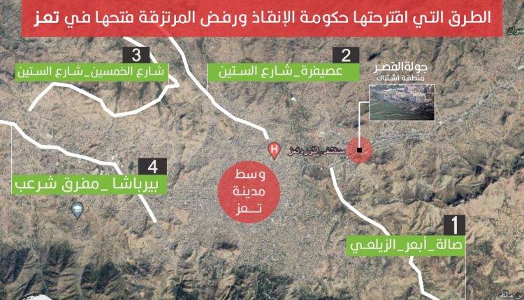 وبحسب مصادر ديبلوماسية تحدّثت إلى «الأخبار»، فإن تلك المقترحات، التي صاغها غروندبرغ ونائبه معين شريم، تتشابه مع رؤية وفد صنعاء، الذي دعا إلى فتح الطرقات والمنافذ على مراحل، والبدء بمنفذَين يقعان تحت سيطرة الجيش و«اللجان الشعبية»، ويصلان منطقة الحوبان بالمناطق الواقعة تحت سيطرة ميليشيات «الإصلاح» داخل مدينة تعز، إضافة إلى طريقَين فرعيَّين، مقابل فتح طريق دولي يربط محافظة تعز بمحافظة لحج وصولاً إلى مدينة عدن. إلّا أن هذا المقترح قوبل برفض ما يسمى «المجلس الرئاسي»، الذي أصرّ الوفد التابع له على فتح جميع الطرقات الرئيسة في تعز، ومن دون شروط مسبقة، بعدما أبدى وفد صنعاء استعداده لخطوة من هذا النوع، في حال تمّ إخلاء المواقع العسكرية كافة، وكذلك المئات من المنازل التي تحوّلت إلى ثكنات، وخاصة في الطريق الرابط بين جولة القصر والحوبان، حيث يتقاسم الطرفان السيطرة.