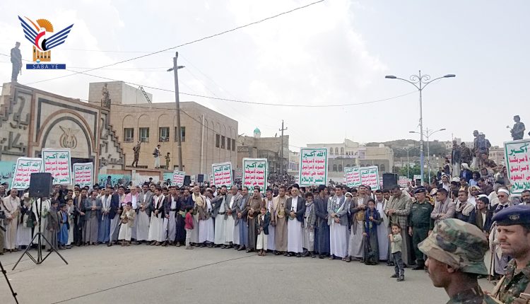 وردد المشاركون في المسيرة التي تقدّمها أمين عام محلي المحافظة إسماعيل المهيم، شعار الصرخة تأكيداً على دوره في توحيد صف الأمة وتعزيز الصمود والثبات في مواجهة العدوان الأمريكي السعودي الإماراتي.