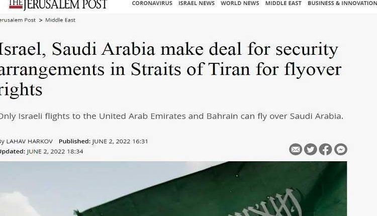 أفادت صحيفة “جيروزاليم بوست” العبرية بأن اتفاقاً سعودياً إسرائيلياً مصرياً تم التوصّل إليه، يتيح للرياض فرض سيادتها على جزيرتي تيران وصنافير، مقابل فتح الأجواء السعودية أمام رحلات طيران كيان العدو.