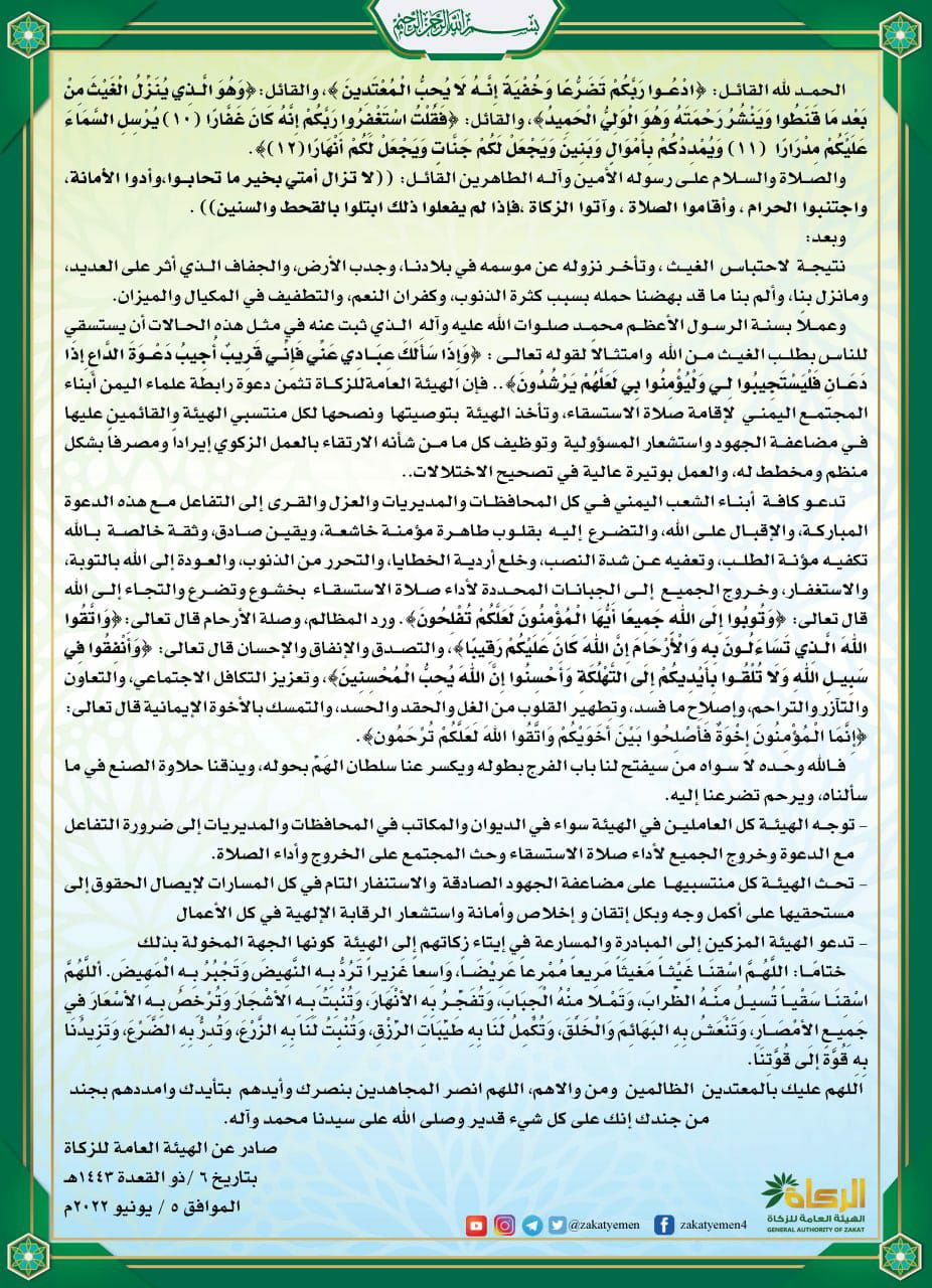 هيئة الزكاة تدعو أبناء الشعب اليمني إلى التفاعل مع دعوة رابطة علماء اليمن لإقامة صلاة الإستسقاء