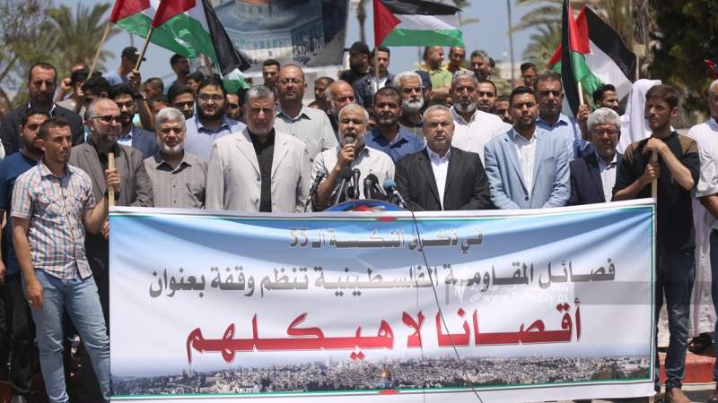 وقالت فصائل المقاومة الفلسطينية بغزة خلال الوقفة الجماهيرية الحاشدة التي تنظمها في الذكرى ال55 للنكسة ورفضاً للعدوان على الأقصى بعنوان (أقصانا لا هيكلهم) ، موضحةً ان الشعب الفلسطيني الذي شرع سيف القدس يقف شامخاً في وجه الاحتلال.