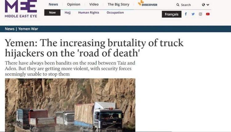 وتطرق التقرير الذي نشره موقع “ميدل إيست آي” إلى جريمة ارتكبتها المليشيات مؤخرا على طريق “طور الباحة” والتي أقدمت فيها على قتل الطفل أكرم العزعزي أثناء تواجده في الشاحنة التي كان يقودها والده، مشيرا إلى أن سائقي الشاحنات على ذلك الطريق نفذوا إضرابا للاحتجاج على تلك الجريمة.