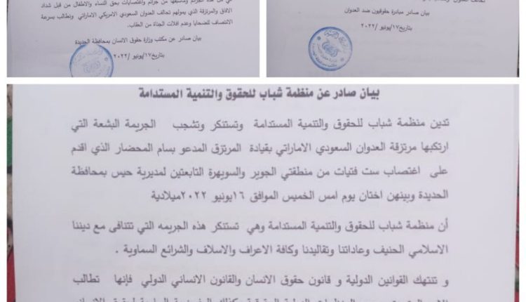 أدان مكتب حقوق الإنسان ومنظمة شباب للحقوق والتنمية المستدامة ومبادرة حقوقيون ضد العدوان في محافظة الحديدة جريمة اغتصاب ست فتيات في منطقتي الجوير والسويهرة بمديرية حيس من قِبل عناصر مرتزقة العدوان.