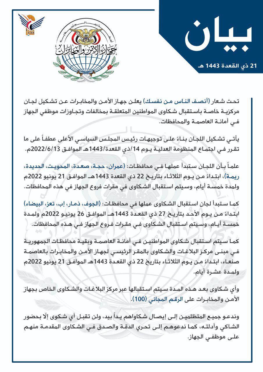 وذكر الجهاز، بأنه سيتم استقبال شكاوى المواطنين في أمانة العاصمة وبقية محافظات الجمهورية في مبنى مركز البلاغات والشكاوى بالمقر الرئيسي لجهاز الأمن والمخابرات بالعاصمة صنعاء، ابتداء من يوم الثلاثاء 22 ذي القعدة الموافق 21 يونيو 2022م ولمدة عشرة أيام.