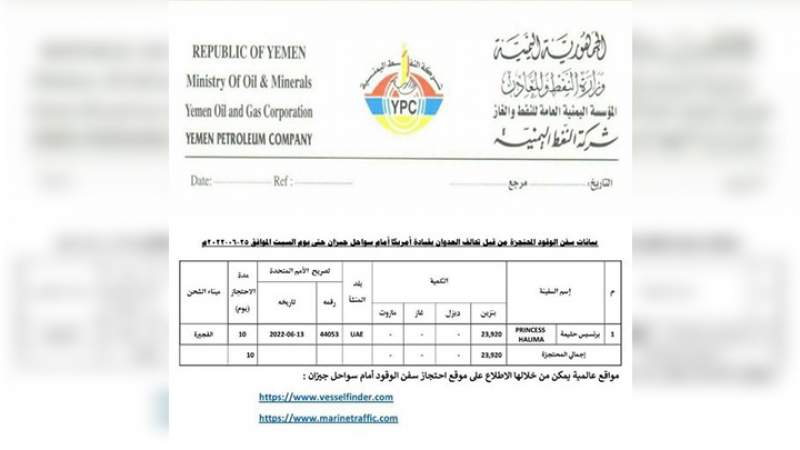 أعلنت شركة النفط اليمنية، اليوم السبت، أن تحالف العدوان الأمريكي السعودي الإماراتي في مستمر في احتجاز سفينة نفطية بحمولة إجمالية تبلغ (23,920) طن من مادة البنزين منذ عشرة.