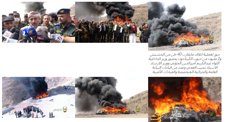 بدوره أكد مدير العلاقات العامة والإعلام الأمني العميد عبدالخالق العجري، أن الكميات التي تم إتلافها، تمثل انجازاً للأجهزة الأمنية في مواجهة مخططات دول تحالف العدوان التي تحاول إغراق اليمن بالمخدرات والجريمة.