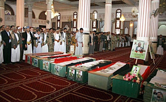 جرت مراسم التشييع للشهداء الذين توشحت جثامينهم بالعلم الجمهوري بعد الصلاة عليهم في جامع الشعب بأمانة العاصمة، ليتم مواراتها الثرى في مسقط رأس كل منهم.