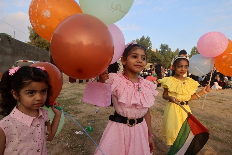 وفي غزة، تزينت الشوارع بالبالونات الملوّنة، وخرج الأطفال إلى الساحات للاحتفال وشراء حلويات التي يعدها الفلسطينيون في العيد كحلوى “القراقيش” و”الكرابيج”.