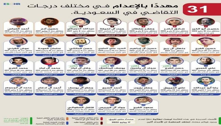 يواجه 31 معتقلًا في السعودية خطر الإعدام في أيّة لحظة، بالرغم من كلّ المُناشدات الإنسانية والحقوقية المستمرة بوضع حدّ للمجازر المتواصلة التي ترتكبها السلطات السعودية بحق المعتقلين.