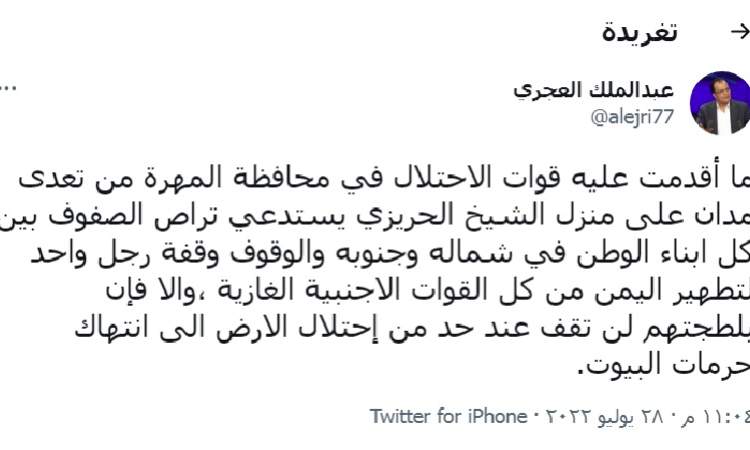 مؤكداً في تغريدة بصفحته بتويتر أن ما أقدمت عليه قوات الاحتلال في محافظة المهرة من تعدى مدان على منزل الشيخ الحريزي يستدعي تراص الصفوف بين كل أبناء الوطن في شماله وجنوبه والوقوف وقفة رجل واحد لتطهير اليمن من كل القوات الأجنبية الغازية.