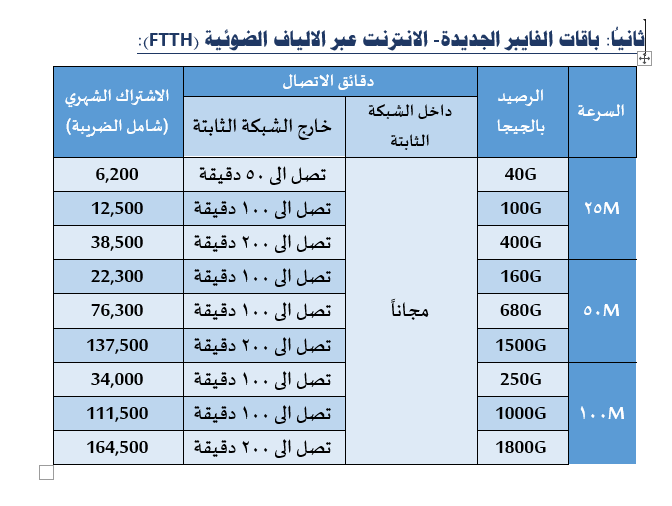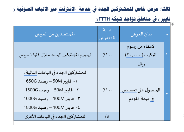 وجاء في البيان انه وبمناسبة العام الهجري الجديد 1444هـ، وتنفيذاً لتوجيهات القيادة السياسية، وحرصاً منها على توفير كافة احتياجات ومتطلبات عملائها بمختلف شرائحهم وفئاتهم سواءً في قطاع الأعمال أو الأفراد يسر المؤسسة العامة للاتصالات تقديم بقات جديدة وبأحجام متعددة وأسعار مناسبة لخدمات الانترنت الثابت عريض النطاق(ADSL-FTTH) لجميع عملائها تشمل تخفيض في سعر الجيجا وزيادة في الأرصدة إضافة الى انزال عرض مصاحب يشمل اعفاء الافراد من رسوم ادخال خدمة الانترنت عبر الالياف الضوئية (FTTH) ومنحهم تخفيضات في أسعار المودمات للمشتركين الجدد.