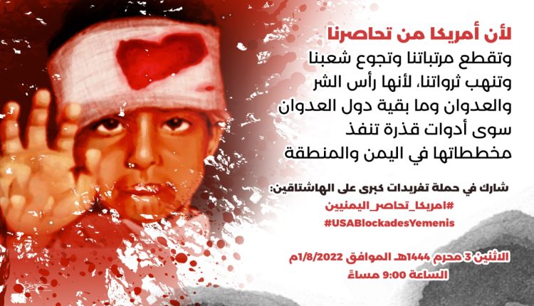 تنطلق في الساعة التاسعة من مساء غد الإثنين حملة تغريدات على موقع التواصل الاجتماعي “تويتر”، لإبراز الدور الأمريكي في الحصار الاقتصادي وقطع المرتبات وتجويع الشعب اليمني ونهب ثرواته.
