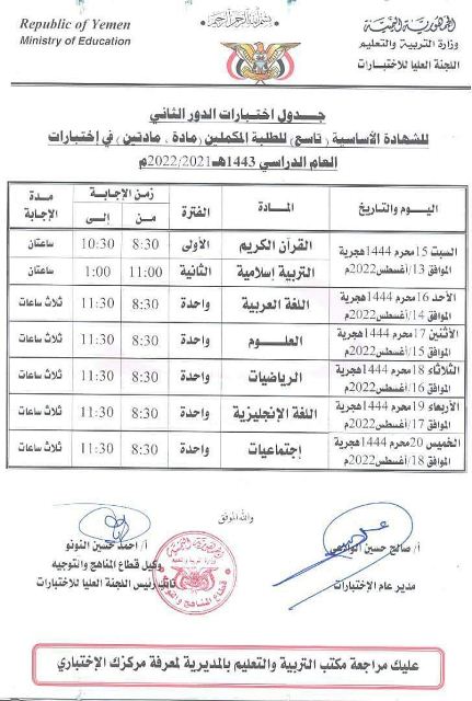 وأكد الوزارة في بيان لها اليوم الجمعة، أن اختبارات الدور الثاني للطلبة المكملين في مادة أو مادتين فقط ستبدأ يوم غد السبت الموافق 15 محرم 1444 هـ – 13 أغسطس 2022م وتنتهي الاختبارات يوم 20 محرم 1444 الموافق 18 أغسطس 2022م.