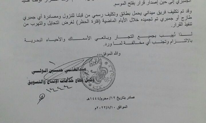 وأهابت وزارة الثروة السمكية، بجميع التجار وبائعي الأسماك والأحياء البحرية الالتزام بالقرار وعدم مخالفته.