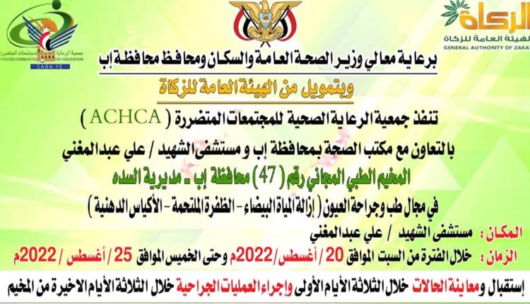 تدشن جمعية الرعاية الصحية للمجتمعات المتضررة، غداً السبت المخيم المجاني الـ47 لطب وجراحة العيون بمديرية السدة في محافظة إب، بالتنسيق مع وزارة الصحة العامة والسكان، وبتمويل من الهيئة العامة للزكاة .