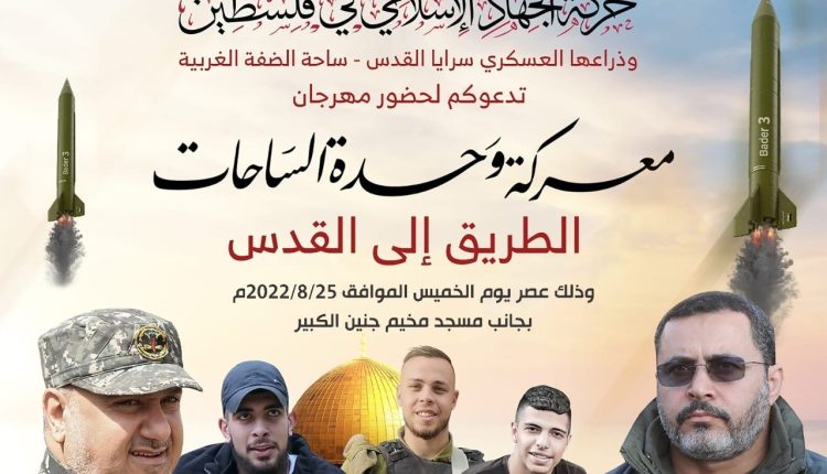 تُنظم حركة الجهاد الإسلامي في فلسطين وجناحها العسكري “سرايا القدس” اليوم الخميس، الحفل الجهادي الكبير “وحدة الساحات.. الطريق إلى القدس”، وفاءً لدماء شهداء معركة “وحدة الساحات”، وتأكيدًا على نهج الجهاد والمقاومة.