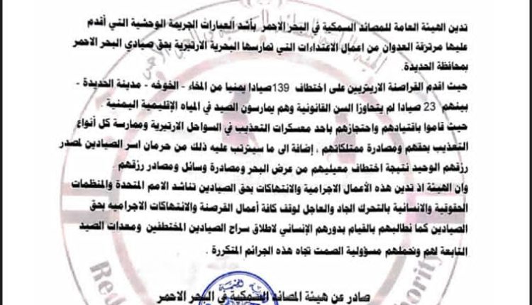 عاجل | بيان لهيئة المصائد السمكية في البحر الأحمر يدين اختطاف اريتريا لـ 139 صياداً يمنياً