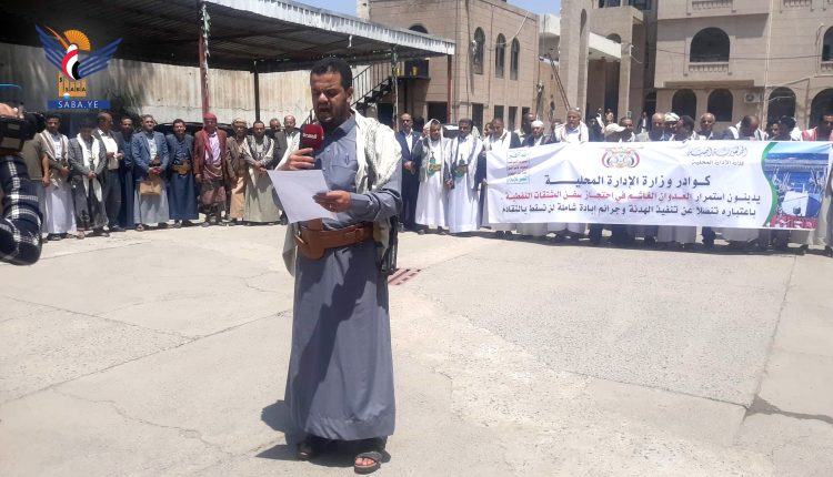 وأدان بيان الوقفة الذي تلاه وكيل الوزارة لقطاع تنمية المحليات عمار الهارب، استمرار احتجاز سفن المشتقات النفطية وتشديد الحصار الاقتصادي وإغلاق المنافذ البرية والبحرية والجوية وكافة جرائم العدوان التي يرتكبها بحق أبناء الشعب اليمني باعتبارها جرائم إبادة شاملة.