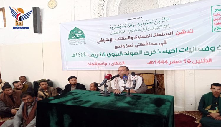 دشنت محافظتا تعز ولحج اليوم الاحتفالات والأنشطة والفعاليات المكرسة لذكرى المولد النبوي الشريف 1444هـ، بفعالية خطابية في جامع الجند بتعز.
