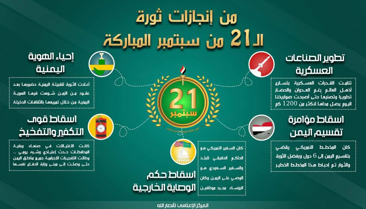 مثلت ثورة الحادي والعشرين من سبتمبر نقطة انطلاق لإيقاف المؤامرات الخطيرة التي كان يتعرض لها اليمن بعد أن وصلت البلاد إلى حالة استلاب القرار السياسي فانطلقت في تكريس مفهوم الشراكة الحقيقية في الداخل واحتواء كل المكونات السياسية الوطنية ، فكان من أهم وأكبر المنجزات للثورة استقلال الشعب اليمني بقراره السياسي والسيادة والحربة ، وقد أشار الى ذلك قائد الثورة السيد عبدالملك بدر الدين الحوثي بقوله :أن مشكلة قوى الاستعمار والاستكبار وعملائها بالمنطقة مع اليمن لا لشيء وإنما لرفضه الخضوع والتبعية، واستكثار هذه القوى على الشعب اليمني أن يكون مستقلًا في قراره السياسي وحقه المشروع في إدارة شؤونه بعيدًا عن التدخل الخارجي.