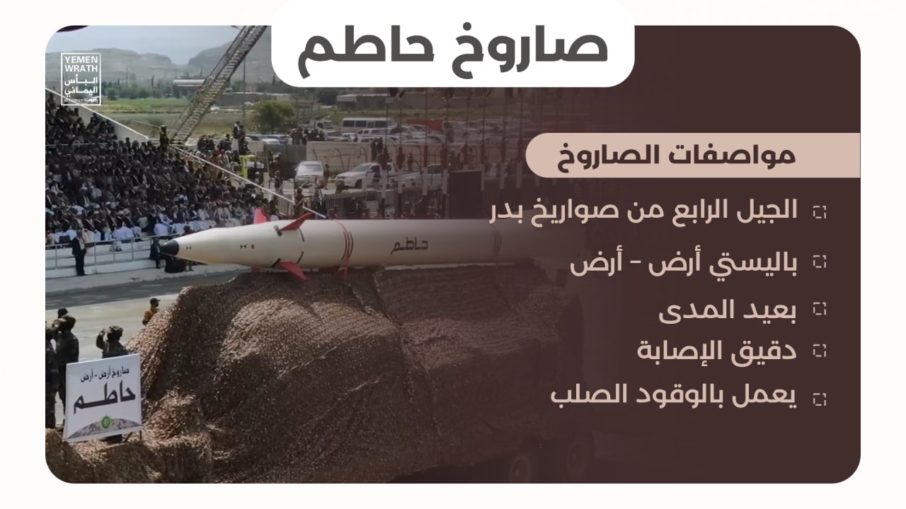 يذكر ان صاروخ “حاطم” أرض-أرض هو صاروخ جديد أنتج ودخل الخدمة مؤخراً، وتمّت تجربته على أهداف بعيدة وسيكون له دور حاسم في الحرب.