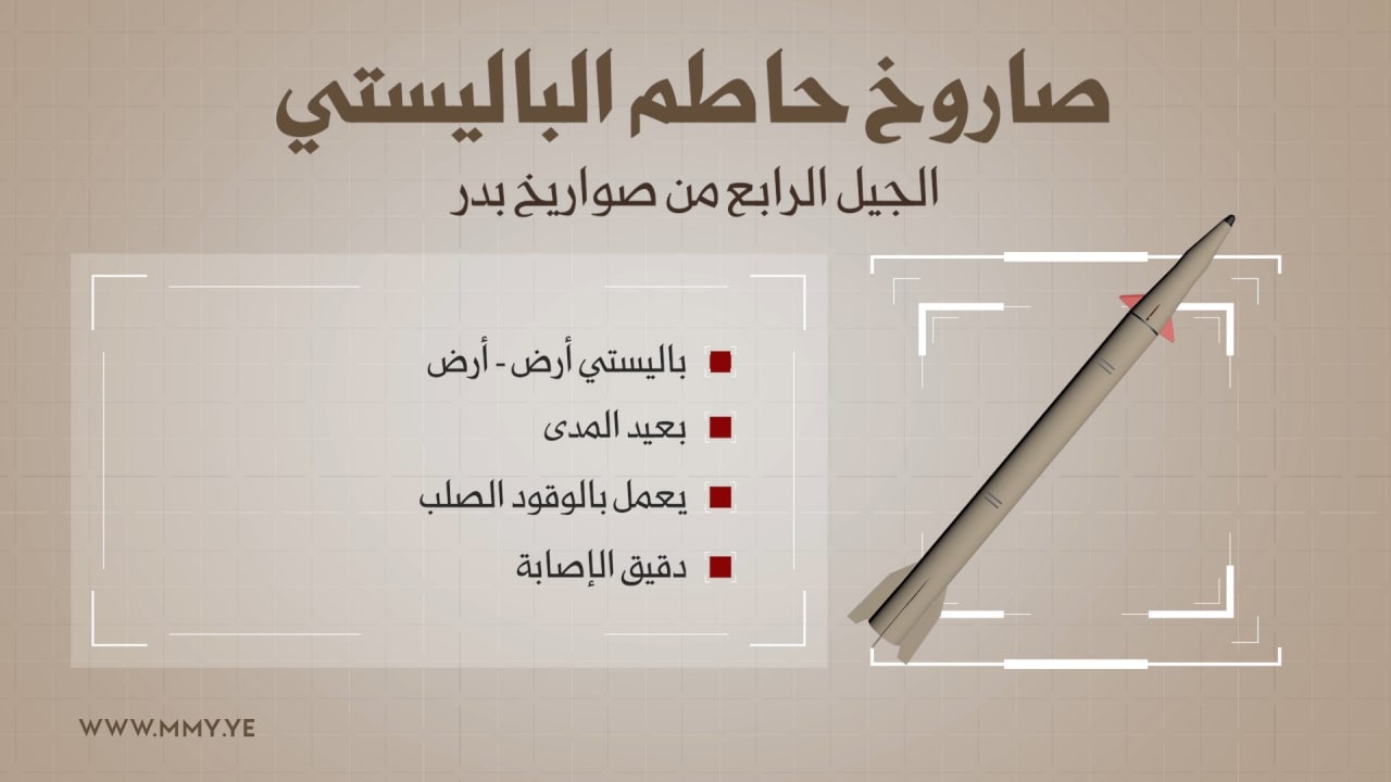 وصاروخ “حاطم” الباليستي، هو صاروخ جديد أرض – أرض، أنتج من قبل هيئة التصنيع الحربي اليمنية ودخل الخدمة مؤخراً وتم تجربته على أهداف بعيدة، وهو صاروخ باليستي بعيد المدى وسيكون له دور حاسم في الحرب والمعركة القادمة.