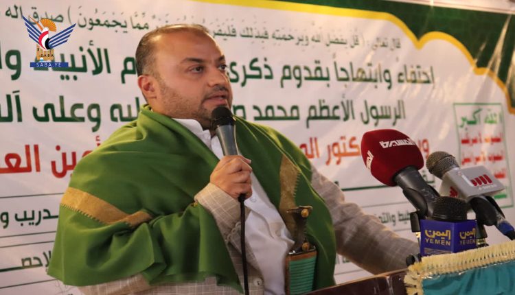وتابع قائلاً ” سنجعل من مدينة صنعاء مدينة منورة مكسوة بالخضرة تفرح بها قلوب المؤمنين ويغتاظ لها صدور الكافرين والمنافقين، وسنجعل إن شاء الله من صنعاء زهرة رسول الله وموئل حب رسول الله صلى الله عليه وعلى آله وسلم “، مؤكداً أن حب الشعب اليمني لرسول الله حب صادق ينبع من ارتباطه بقيمه ودينه.