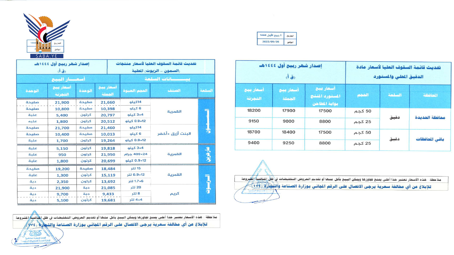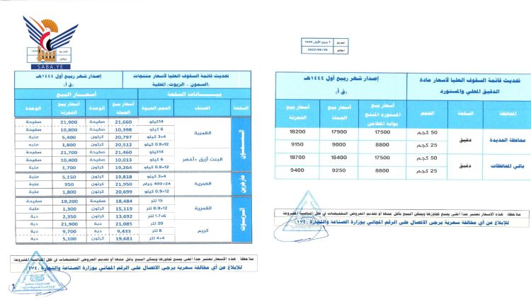 وحددت القائمة السعرية سعر بيع كيس الدقيق حجم 50 كيلو جرام للمستهلك بـ 18200 ريال في محافظة الحديدة، و18700 ريال في باقي المحافظات، كما تم وضع أسعار مخفضة لسلع السمن والزيوت ويجري استكمال وضع الأسعار لبقية السلع الأساسية.