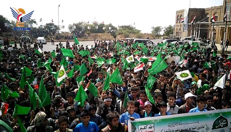 وفي المسيرة التي نظمها مكتب التربية والتعليم بمديرية مدينة المحويت، رفعت الحشود الطلابية اللافتات المعبرة عن الحب والولاء والارتباط الوثيق بالرسول الأعظم صلوات الله وسلامه عليه وعلى آله.