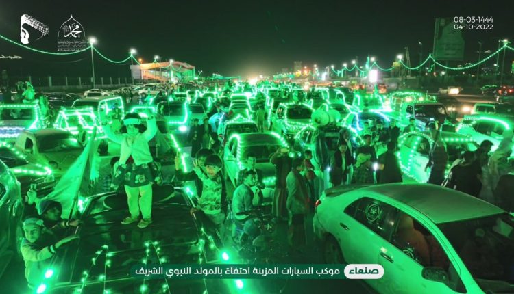 وأفادت مصادر إعلامية أن موكباً كبيراً من السيارات التي تزينت بالزينة الضوئية الخضراء إنطلقت قبل قليل من ميدان السبعين في مسيرة إحتفائية فرحاً وابتهاجاً بالمولد النبوي الشريف ،